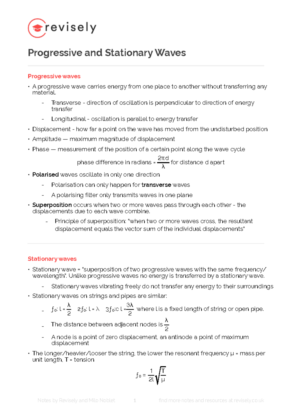 Progressive and Stationary Waves: Key Concepts and Definitions - Studocu
