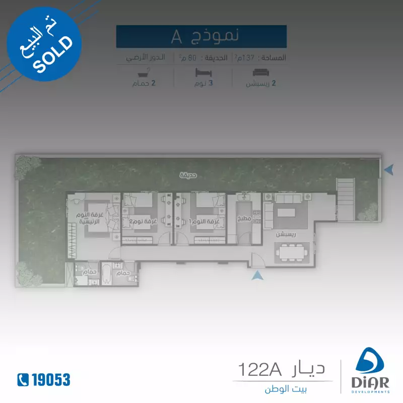 شقق للبيع في حي بيت الوطن | ديــار 122A | نموذج A - دور أرضي 137م2