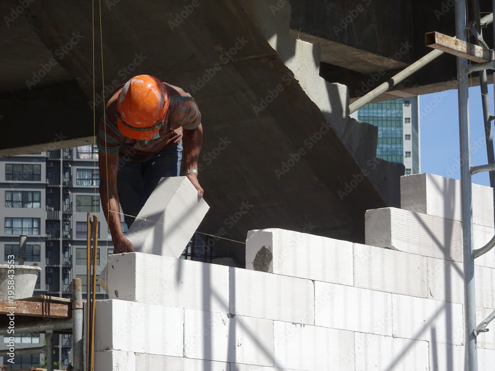 Premium Photo | Masonry worker laying autoclaved aerated concrete ...