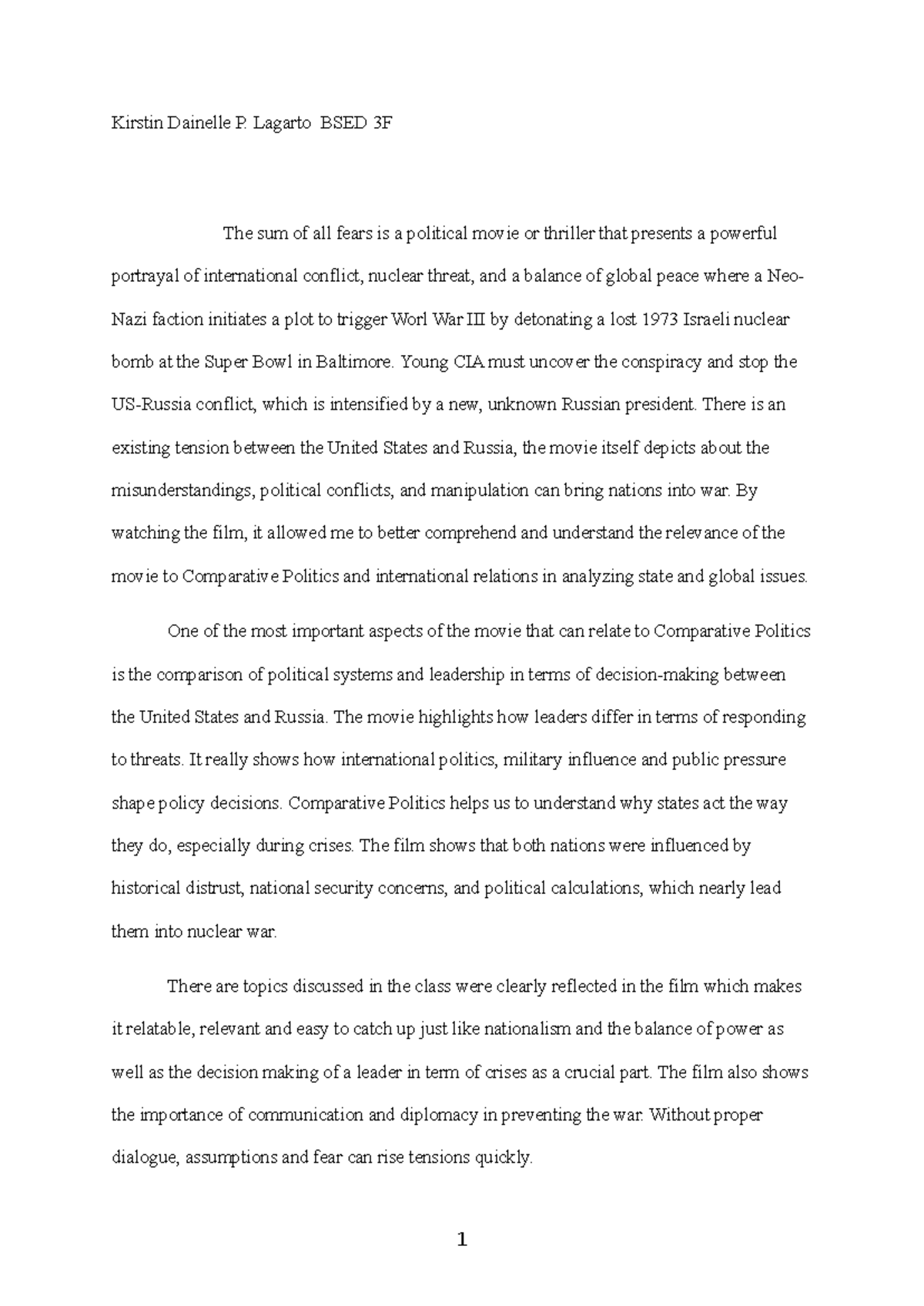 Kirstin Dainelle P. Lagarto BSED 3F: The Sum of All Fears - A ...