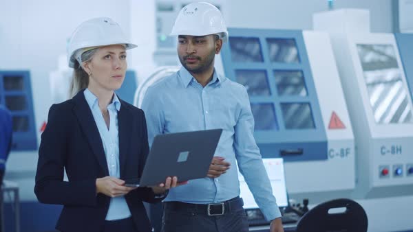 Chief Engineer and Project Manager Wearing Safety Vests, Hard Hats Walk ...