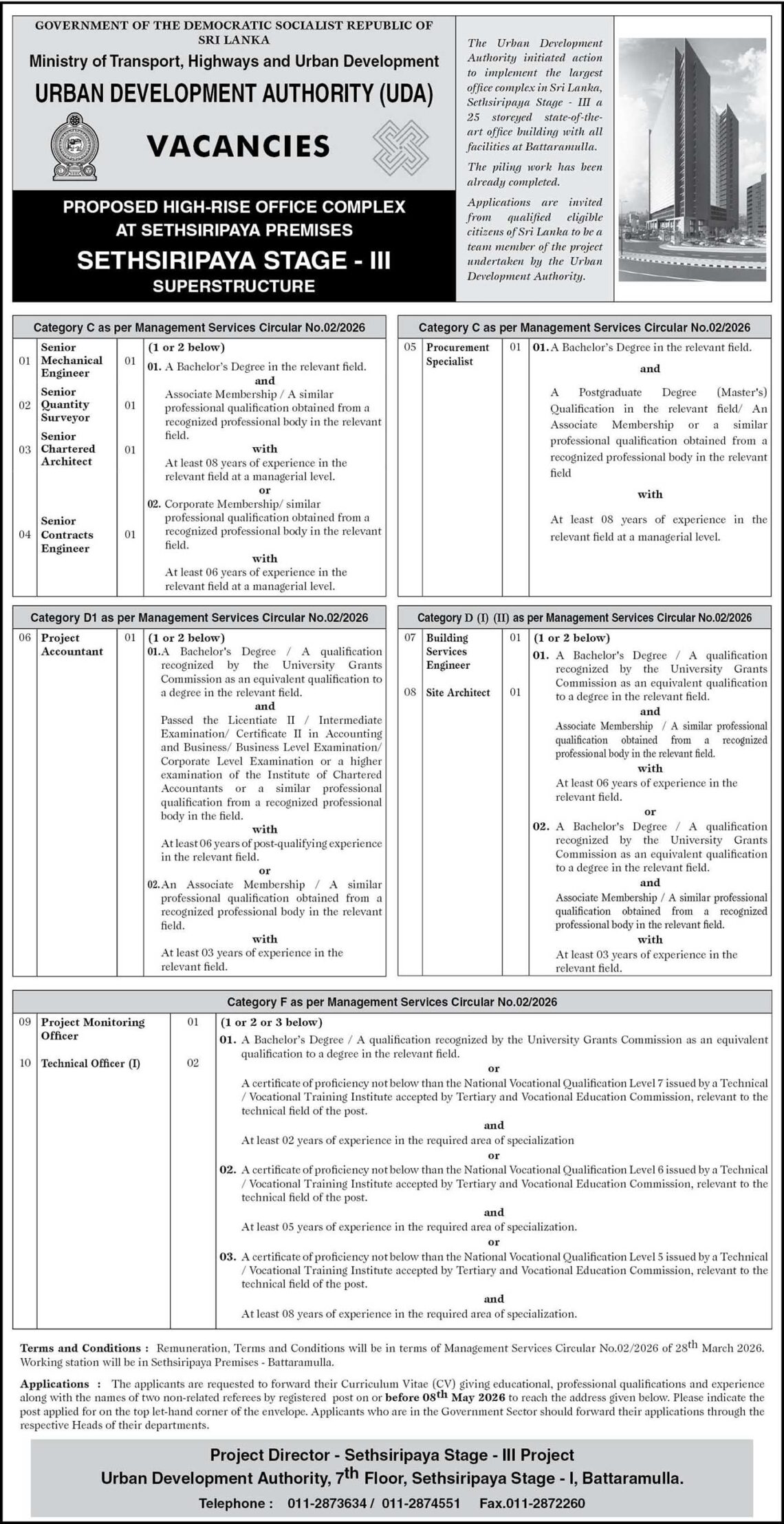 UDA Vacancies 2026 – Sethsiripaya Stage III Project - TeachMore: SL ...