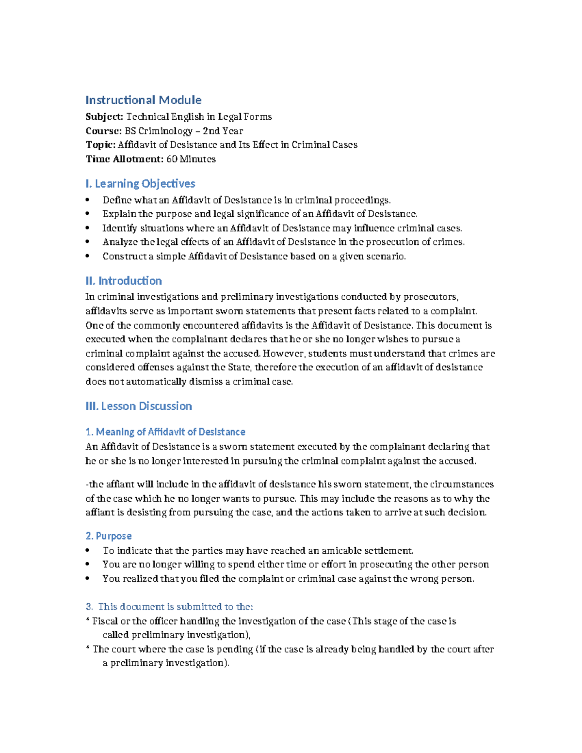Affidavit of Desistance Module for BS Criminology 2nd Year - Studocu