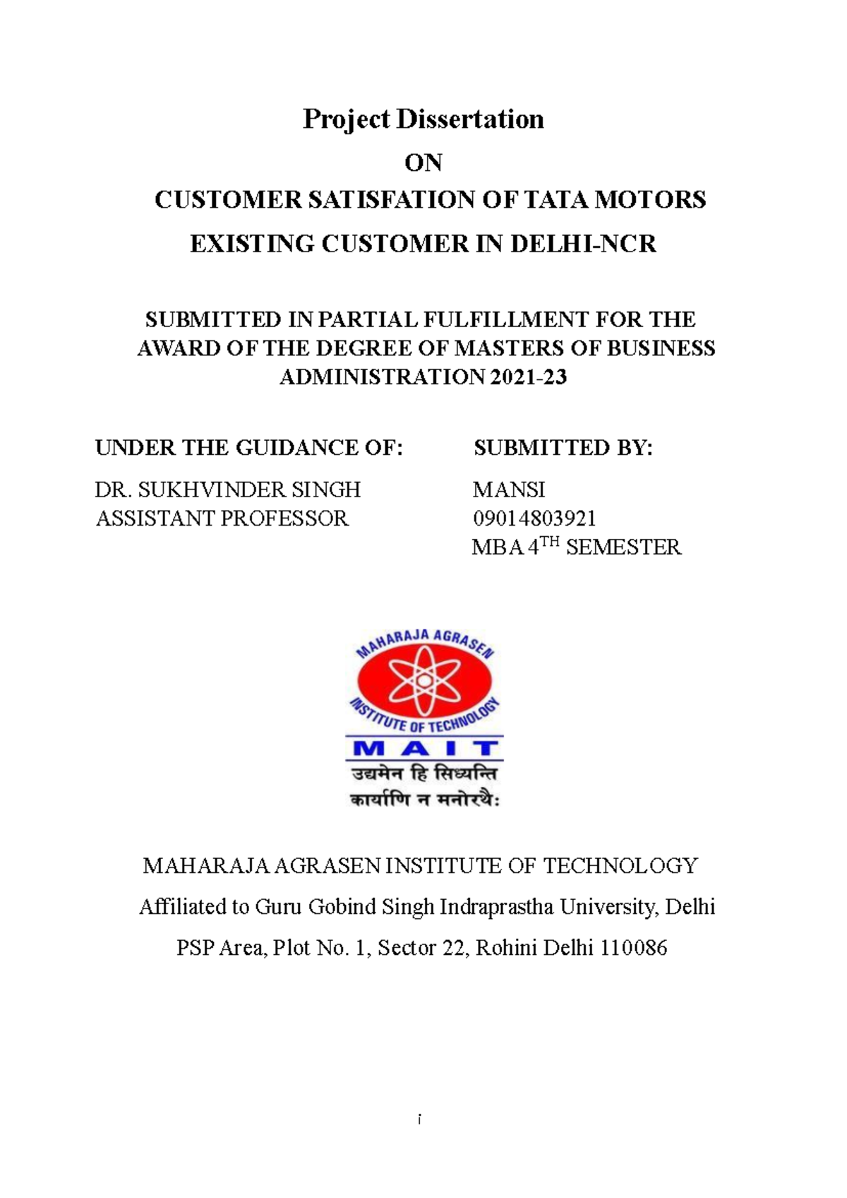 Project Dissertation- Mansi - i Project Dissertation ON CUSTOMER ...