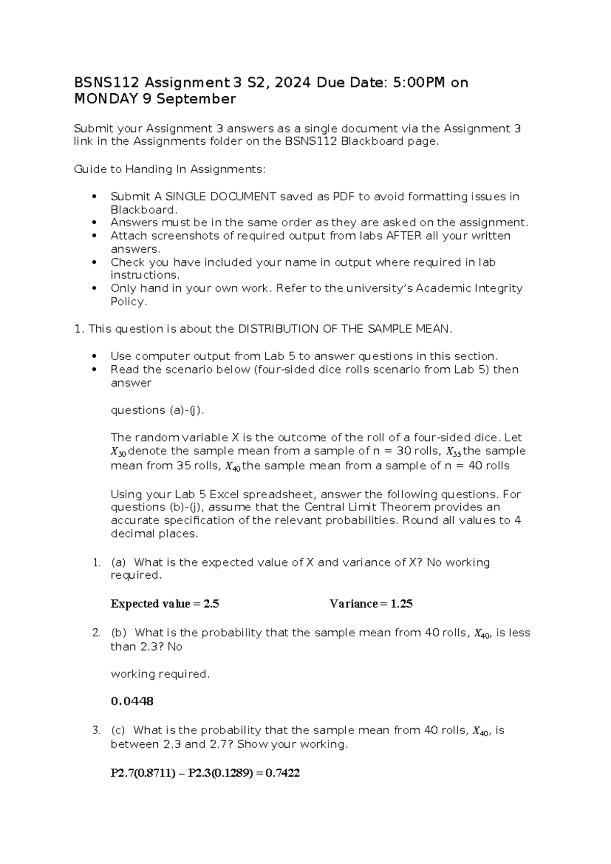 BSNS112 Assignment 3: Sample Mean Distribution Analysis S2 2024 - Studocu