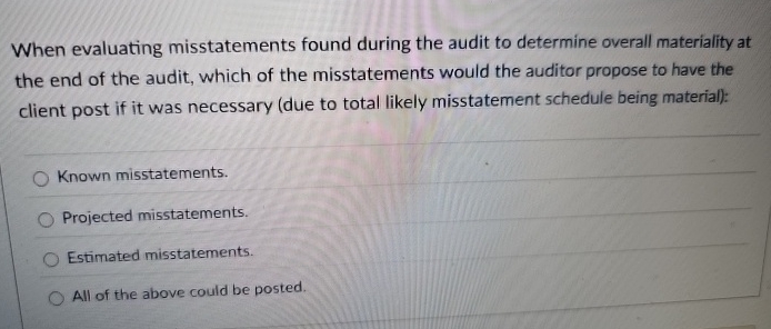 Solved When evaluating misstatements found during the audit | Chegg.com