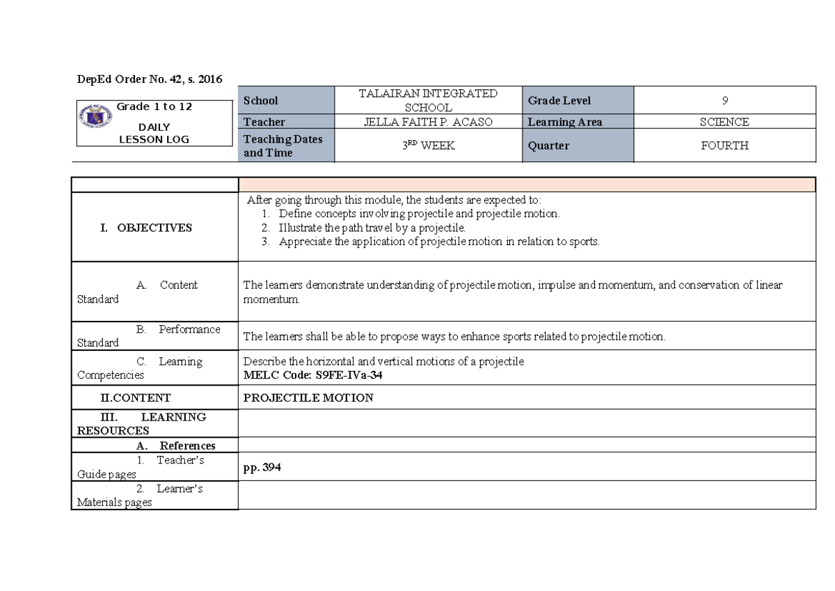 Grade 9 Science: Projectile Motion Self Learning Module | Course Hero