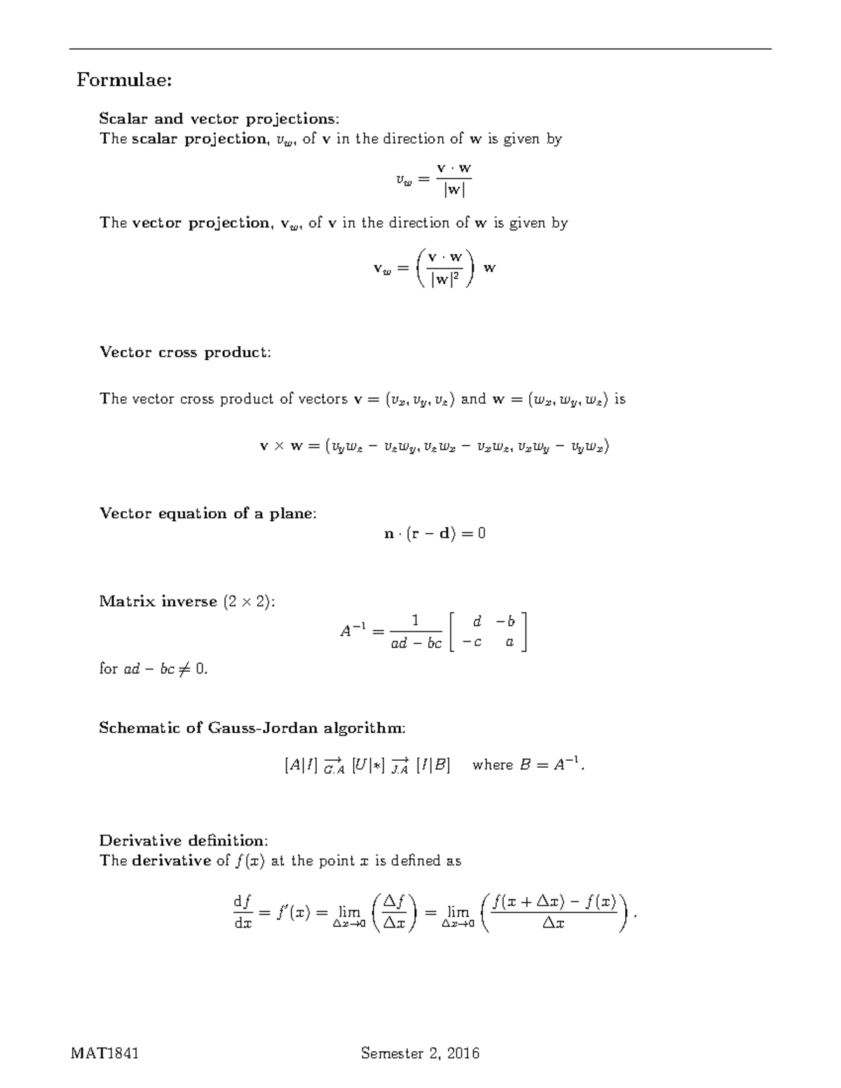 Formula Sheet MAT1841 - Formulae: Scalar and vector projections ...