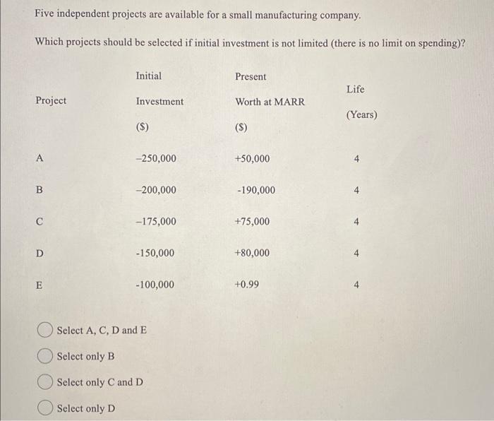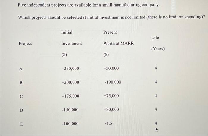 Solved Five independent projects are available for a small | Chegg.com