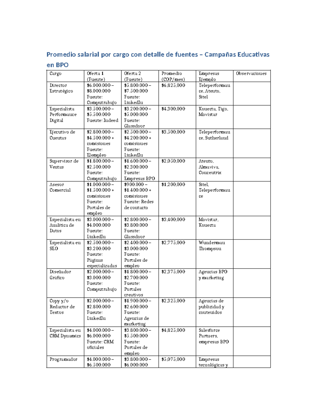Promedio Salarial Detallado BPO: Fuentes y Cargos Específicos - Studocu