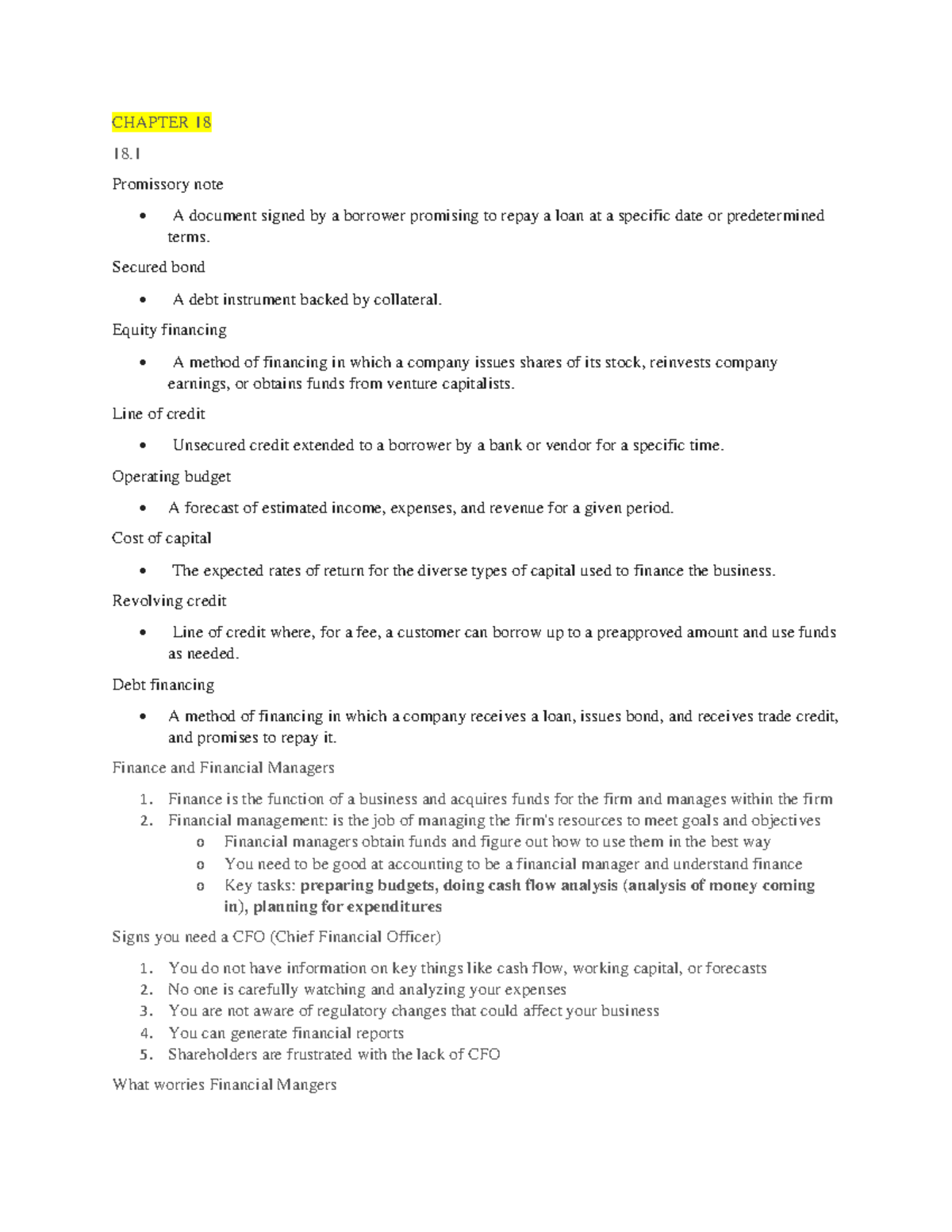 BUSN101 CH20 Notes - CHAPTER 18 18. Promissory note A document signed ...