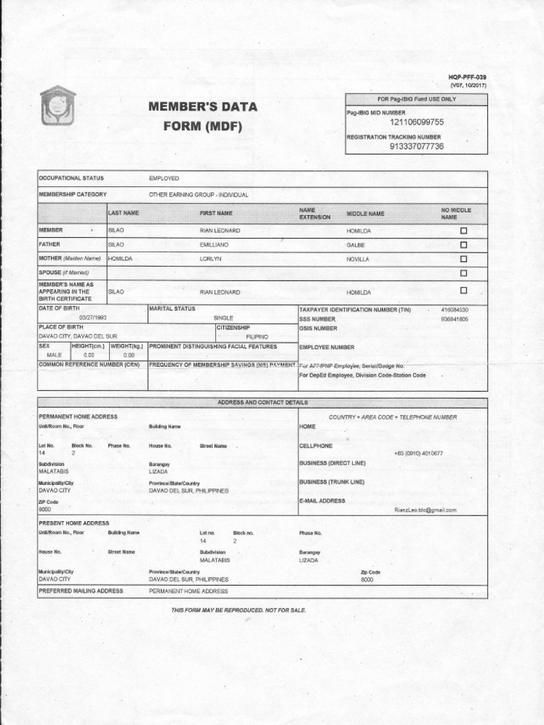 Member Data Form for HDMF | PDF | Birth Certificate | Employment