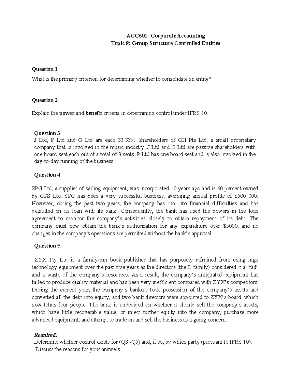 ACC601: Corporate Accounting Tutorial 8 - Group Structure & Control ...