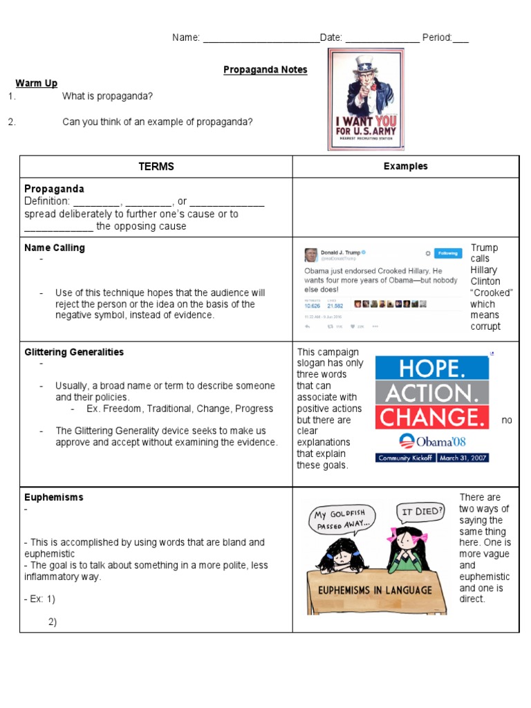 Propaganda Techniques: Notes (w/KEY) and Fun Assignment! | TPT