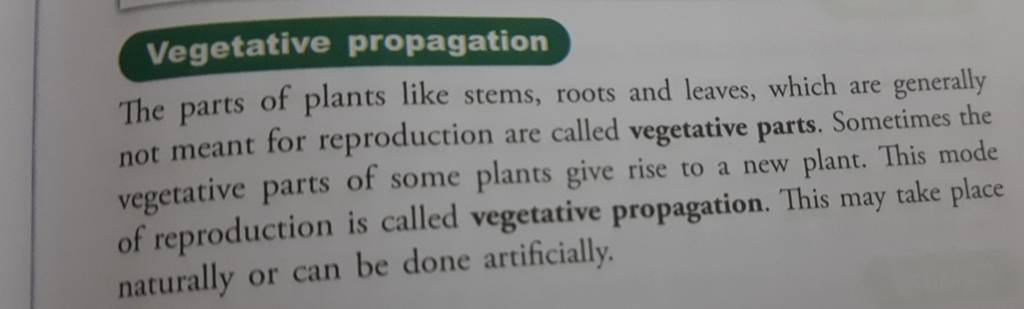 Vegetative propagation The parts of plants like stems, roots and leaves,