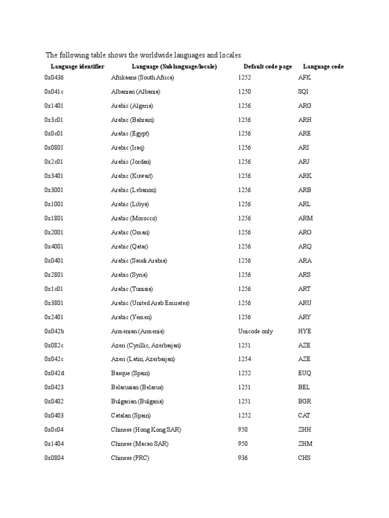 The Following Table Shows The Worldwide Languages and Locales | PDF ...