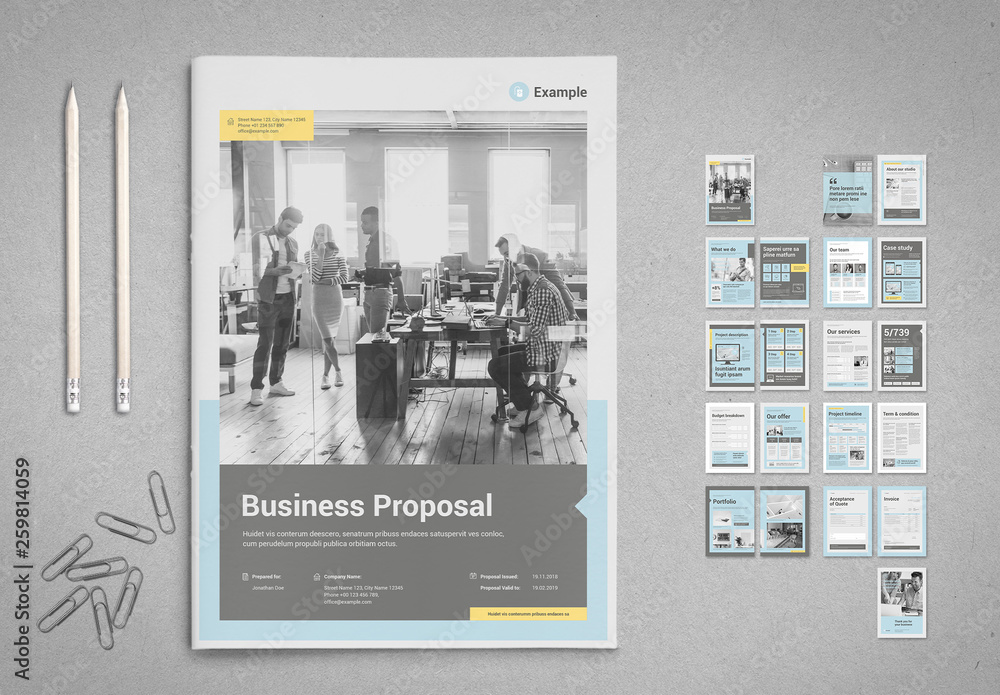 Business Proposal Layout in Pale Blue with Gray with Yellow Accents ...