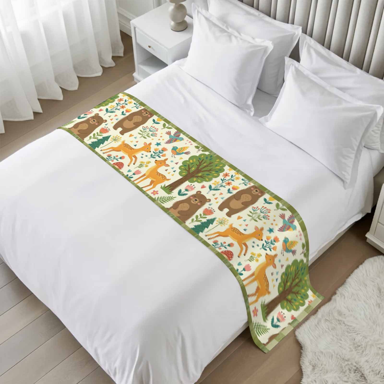 Bed Runner for Twin Size, Green Beige Forest Animals Decorative Scarf ...