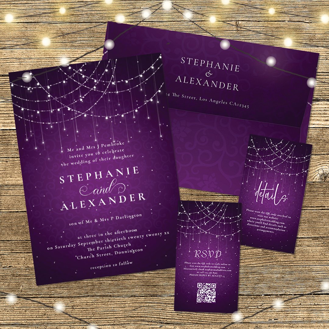 Budget Purple String Lights QR Code Wedding Invite | Zazzle