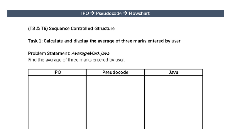 IPO Pseudocode and Flowchart for Java Tasks (T3 T9) - Studocu