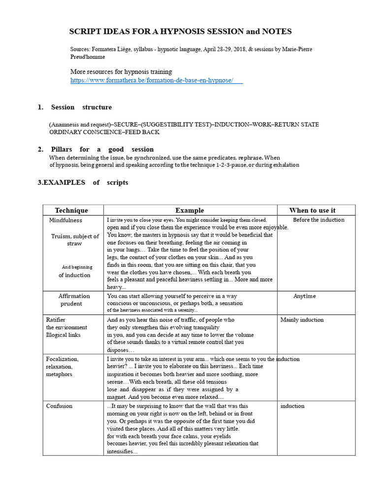 SCRIPT IDEAS FOR A HYPNOSIS SESSION and Notes | PDF | Hypnosis | Psychology