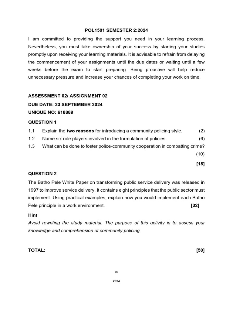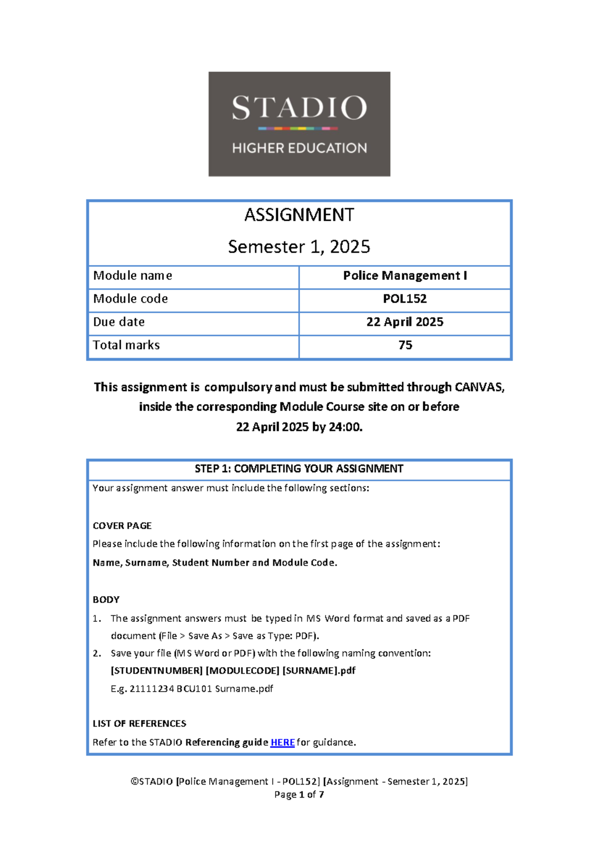Police management I assignment POL152 Semester 1, 2025 guidelines and ...