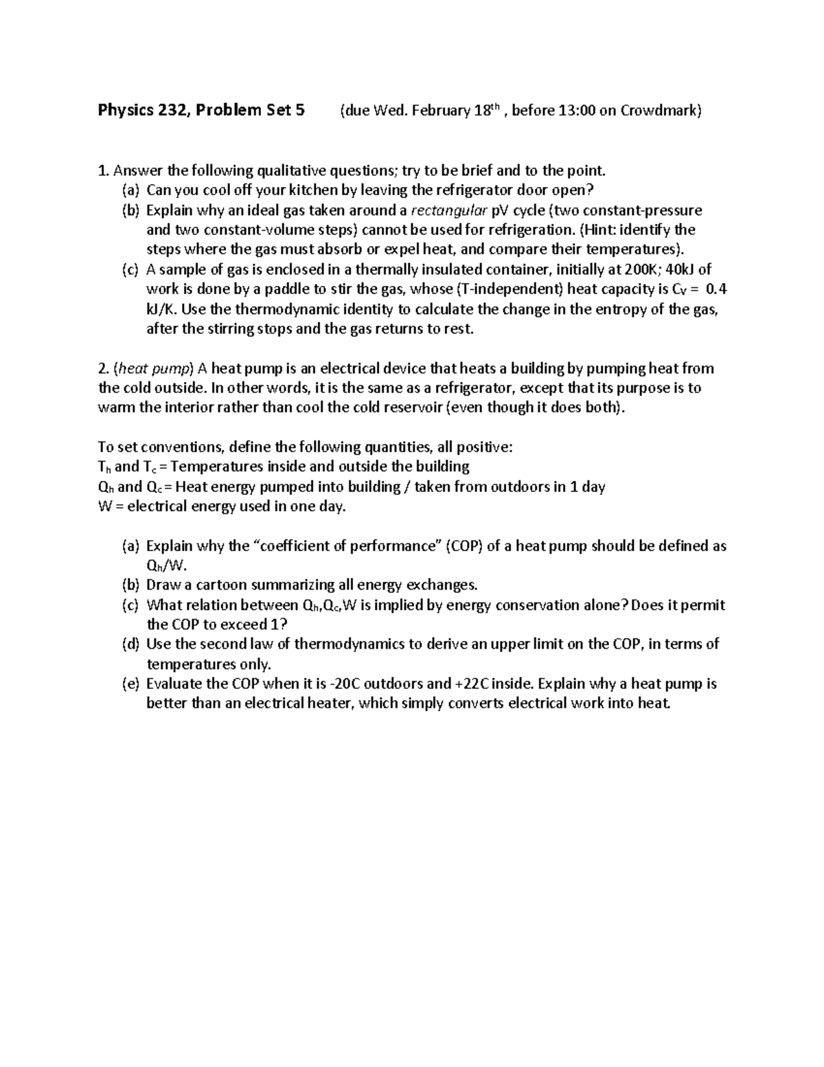 Physics 232, Problem Set 5: Thermodynamics & Heat Pumps - Studocu