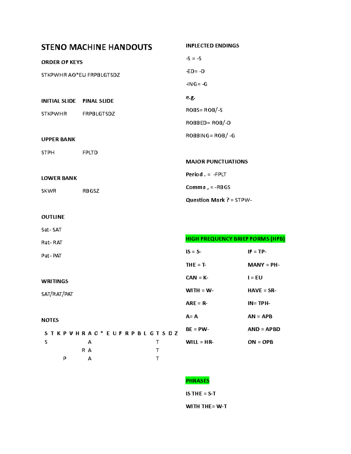 Steno Machine Handouts: Key Order, Brief Forms & Punctuation - Studocu