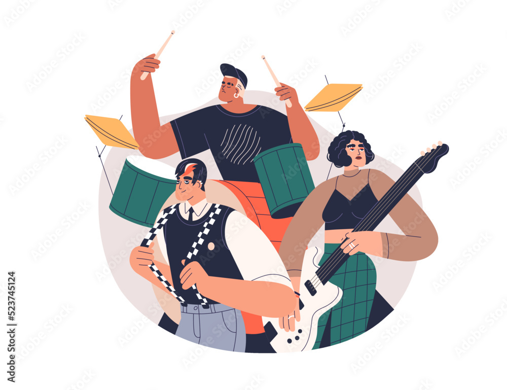 Music band group with young modern musicians performing punk rock. Men ...