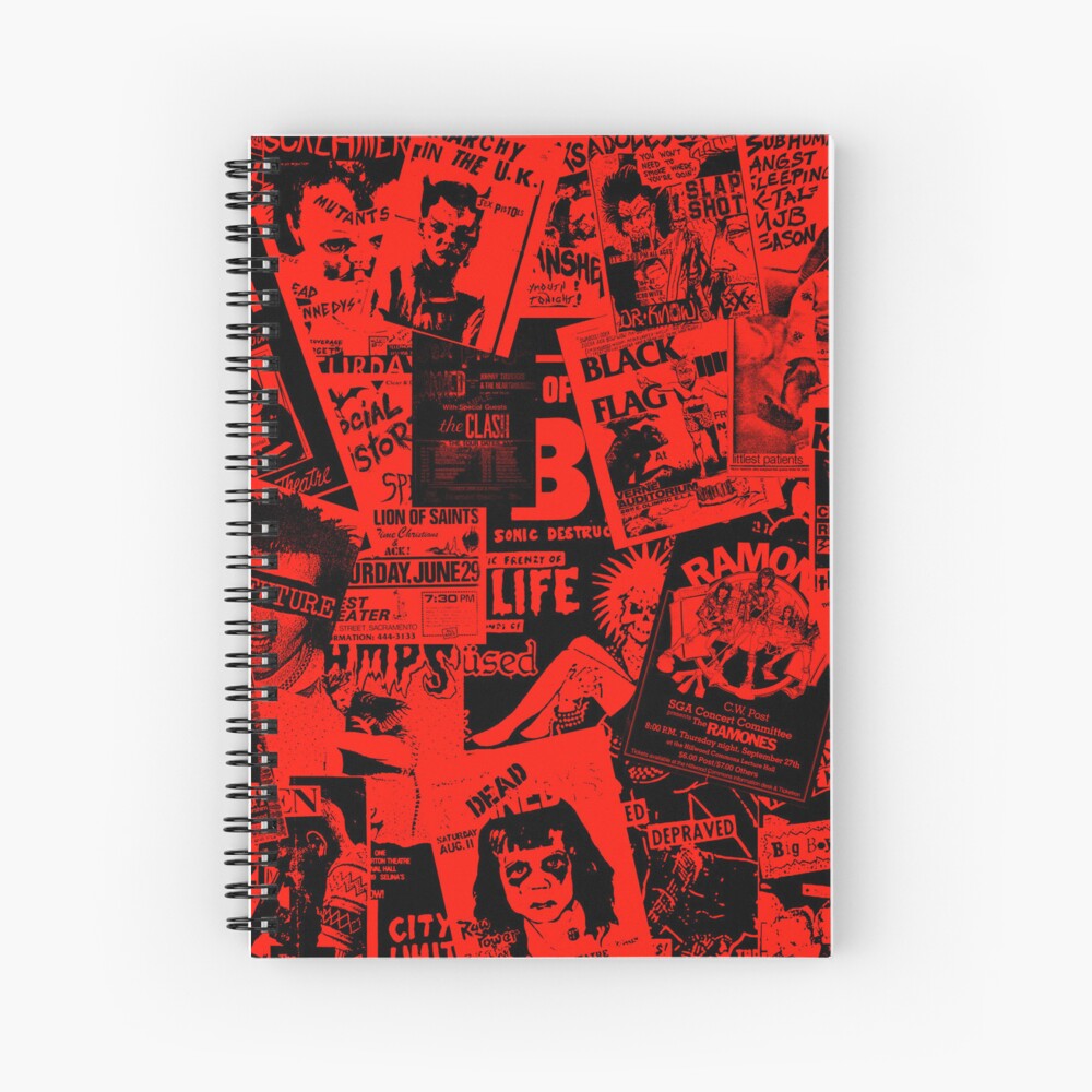 "Punk Rock Bands Flyers Collage Black and Red" Spiral Notebook for Sale ...