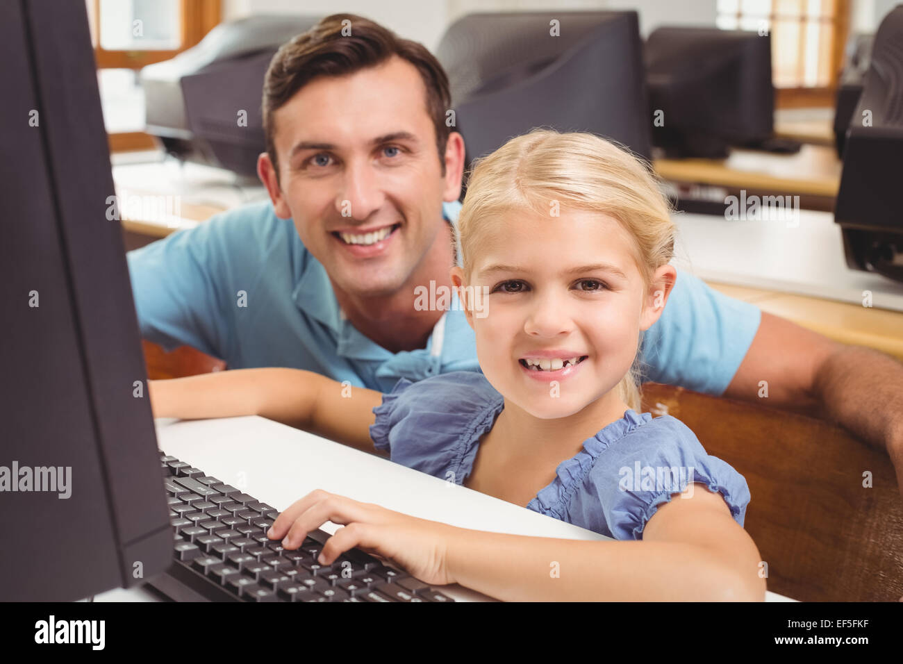 Cute pupil in computer class with teacher Stock Photo - Alamy