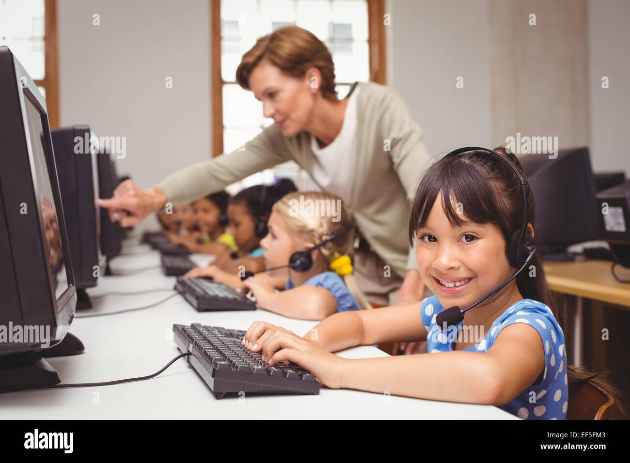 Cute pupils in computer class with teacher Stock Photo - Alamy