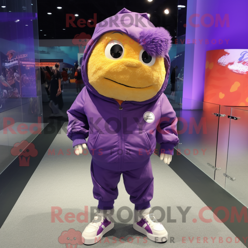 Purple Cod mascot costume character dressed with a Windbreaker and ...