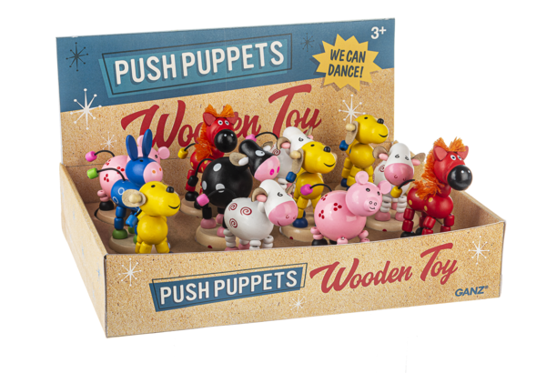 WOODEN FARM ANIMAL PUSH PUPPET TOY 3+ YEARS 6 ASSTD DESIGNS WITH DISPLAY 12