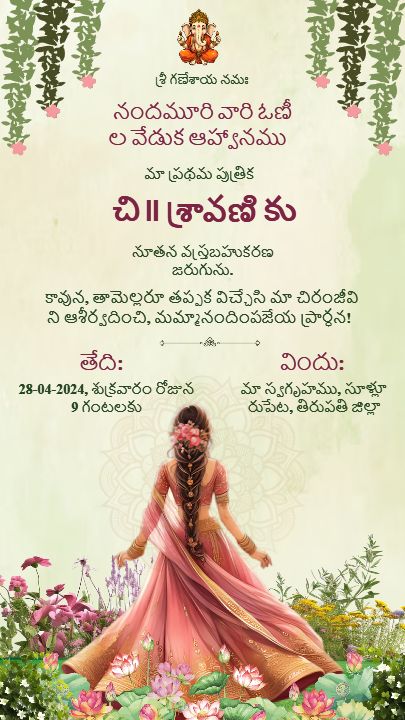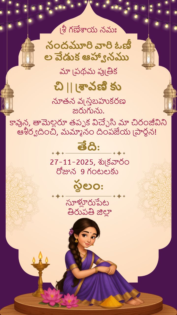 Half Saree Function Invitation in Telugu, Nuthana vastralankarana ...