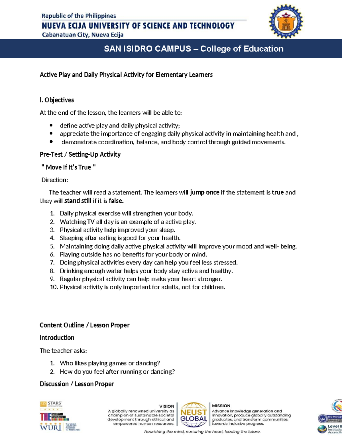 SAN ISIDRO CAMPUS College of Education Active Play & Daily Physical ...