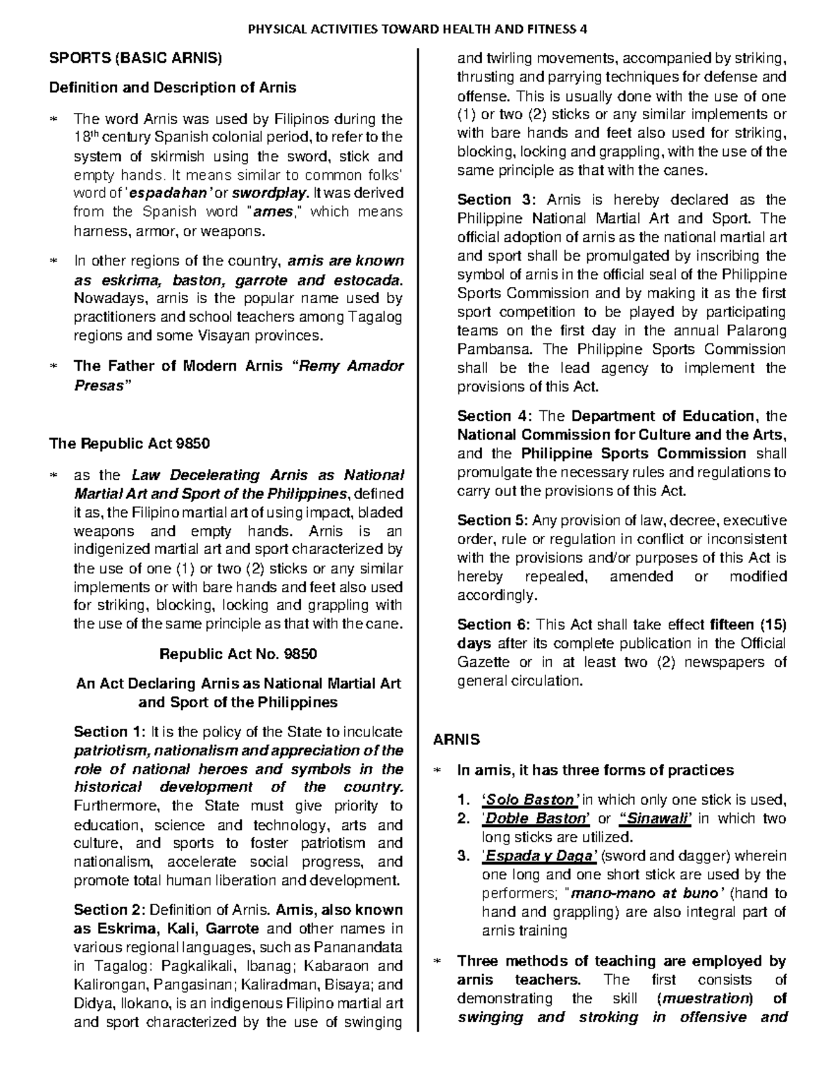 PHYSICAL ACTIVITIES TOWARD HEALTH AND FITNESS 4: BASIC ARNIS Techniques ...