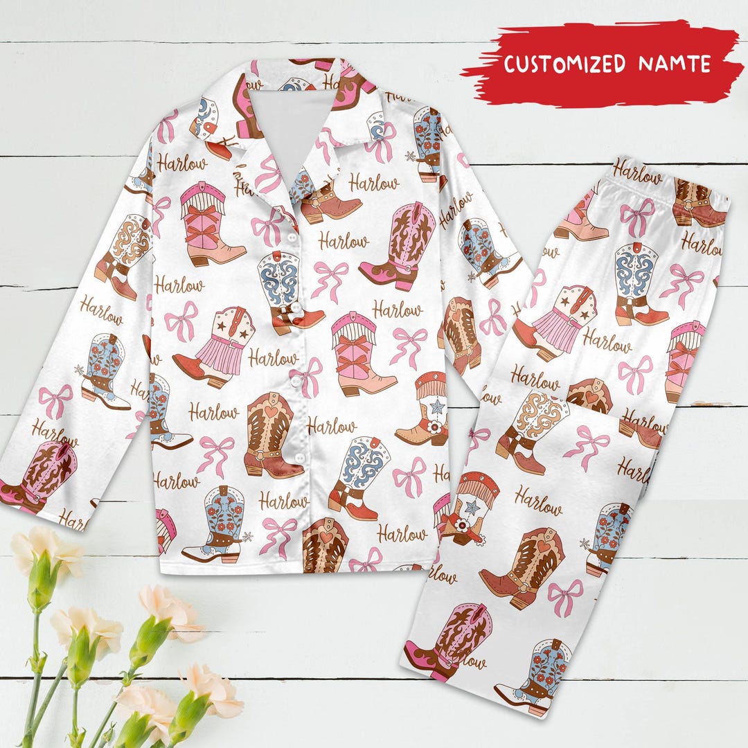 Personalized Cowboy Boots Pajamas, Customized Western Satin Pajama Set ...