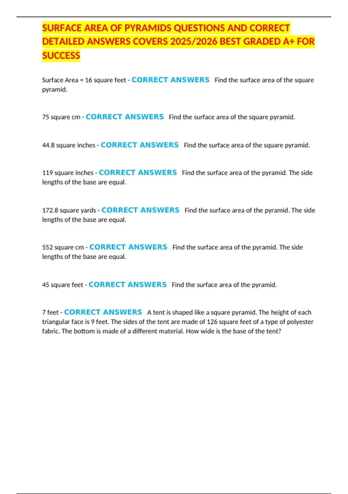 SURFACE AREA OF PYRAMIDS QUESTIONS AND CORRECT DETAILED ANSWERS COVERS ...