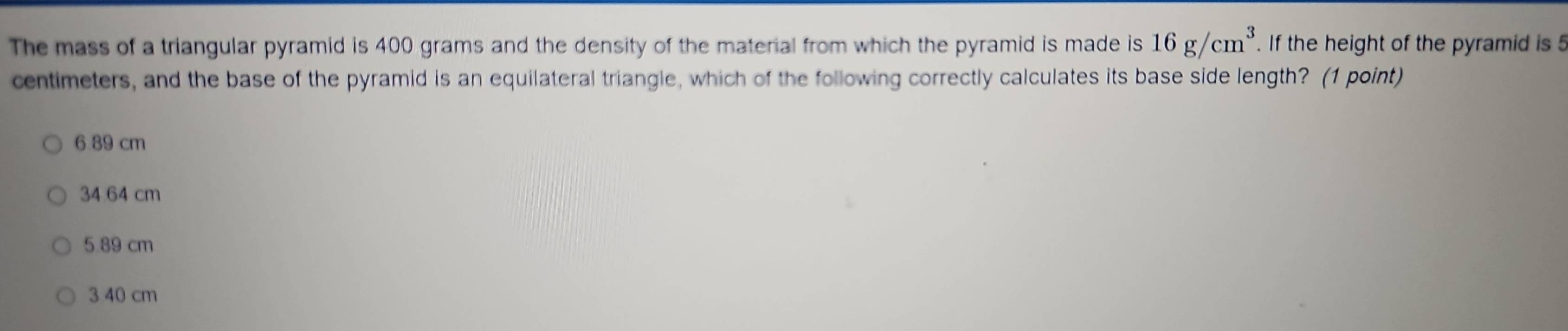 Solved: The mass of a triangular pyramid is 400 grams and the density ...