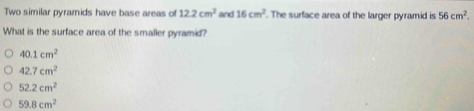 Solved: Two similar pyramids have base areas of 12.2cm^2 and 16cm^2 The ...