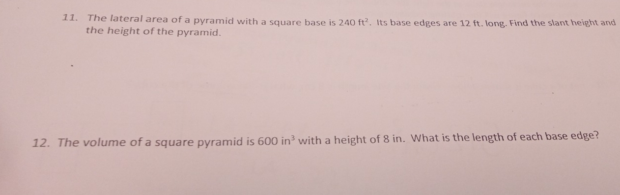 Solved: The lateral area of a pyramid with a square base is 240ft^2 ...