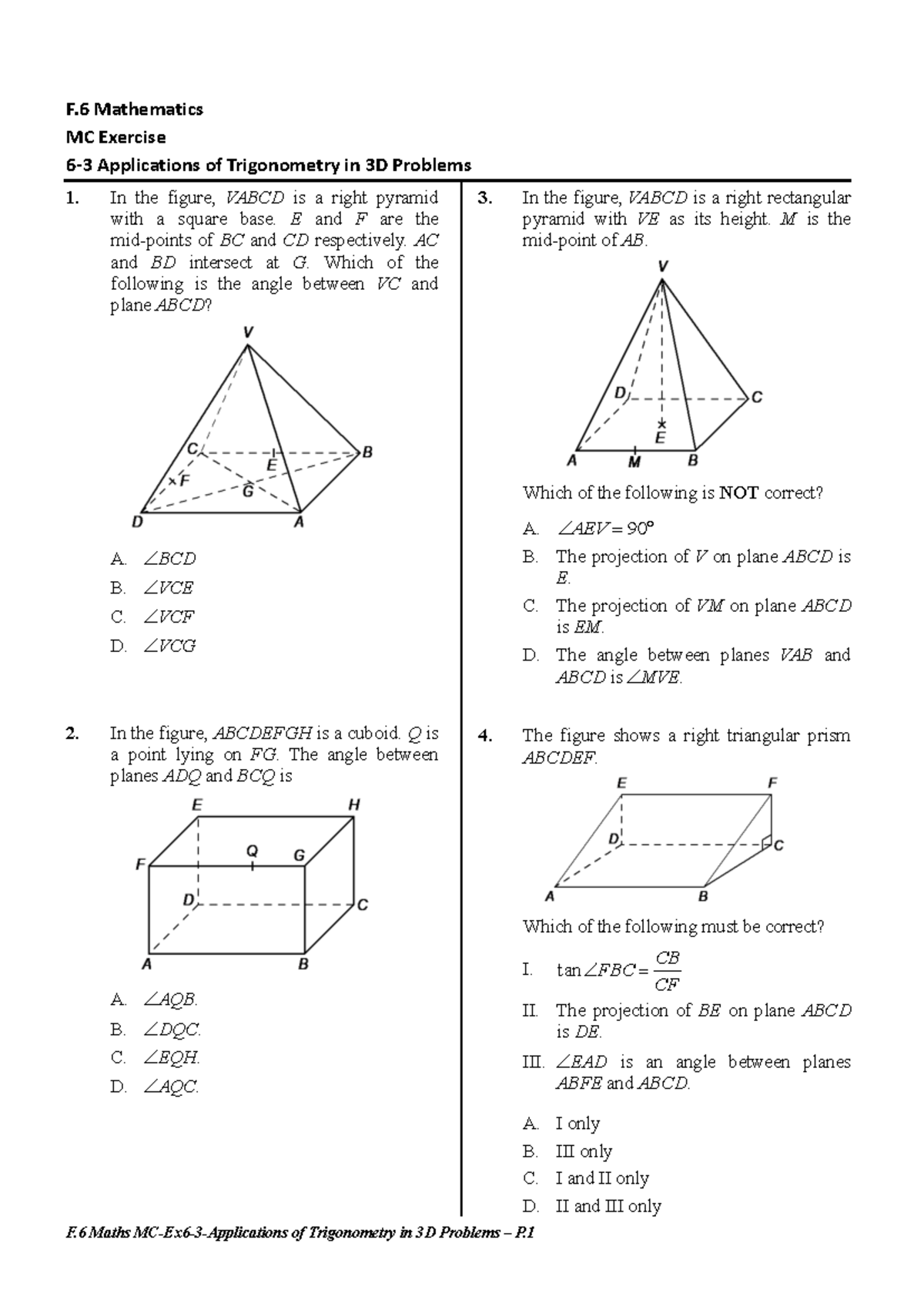 F.6 Maths MC Exercise: Applications of Trigonometry in 3D Problems ...
