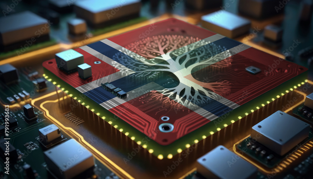 The Norway flag depicted on a microchip integrated within an electronic ...