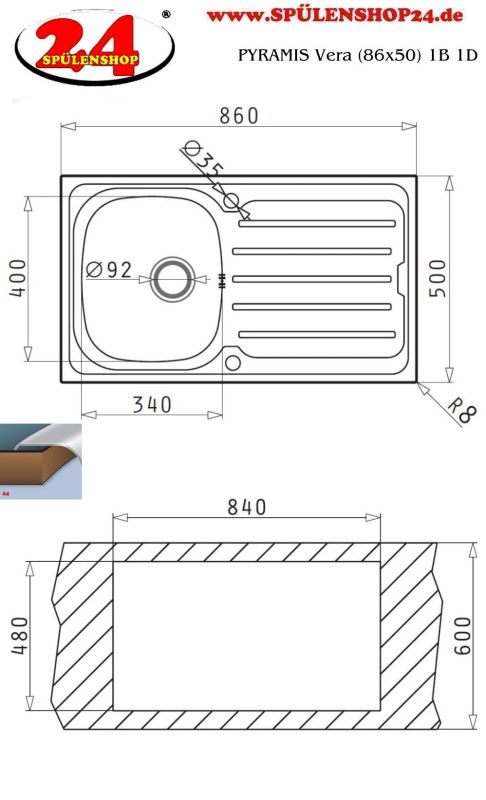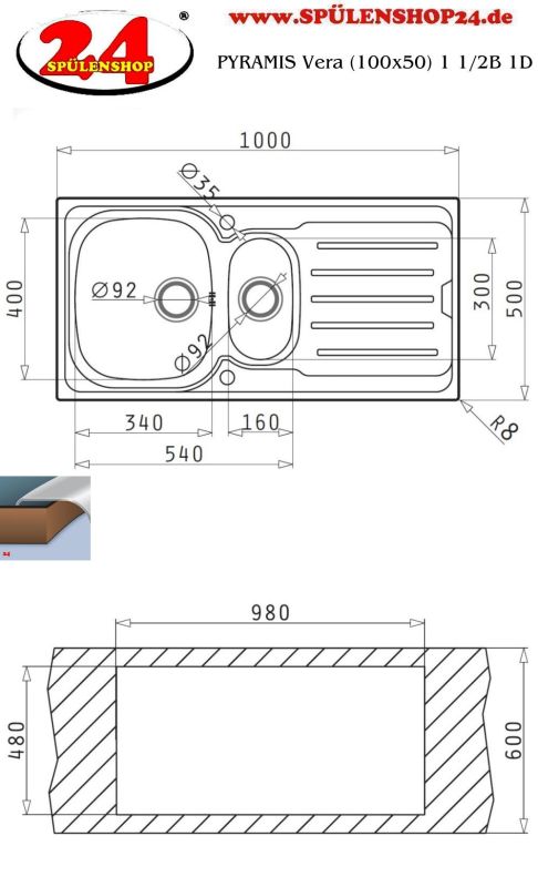 Pyramis Einbauspüle Vera (86x50) 1 B 1 D Edelstahl poliert online kaufen