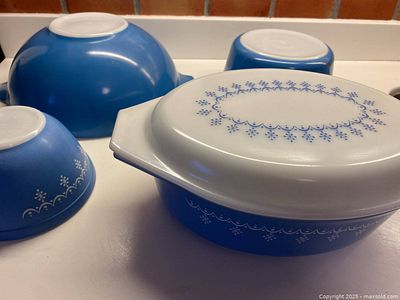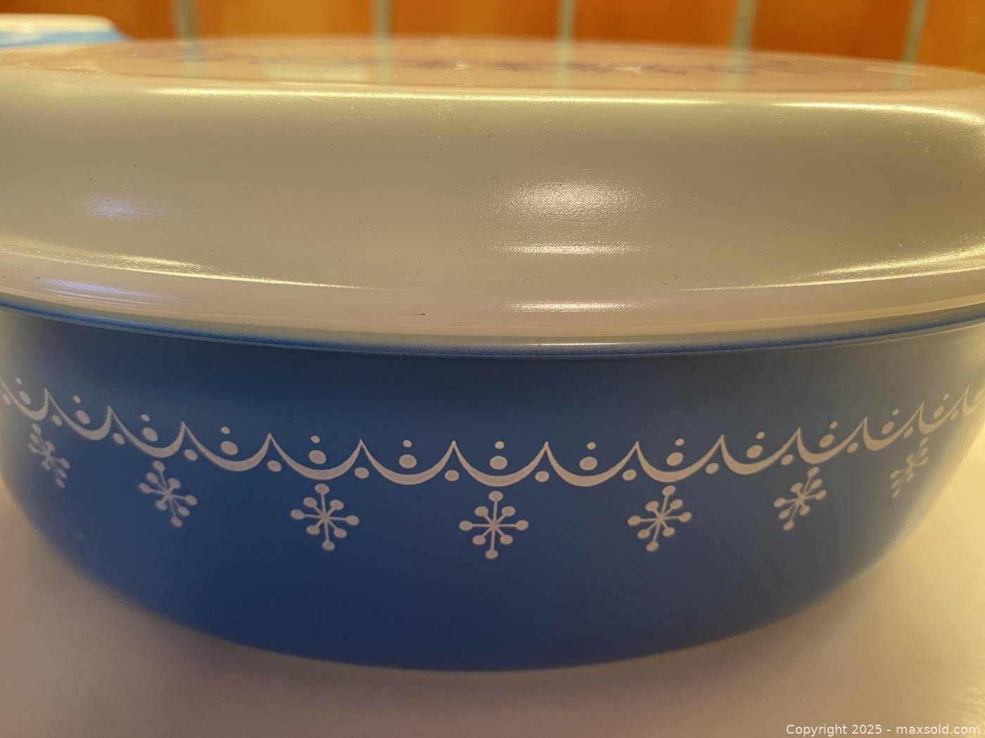 Pyrex Snowflake Blue casserole and bowl set | Maxsold