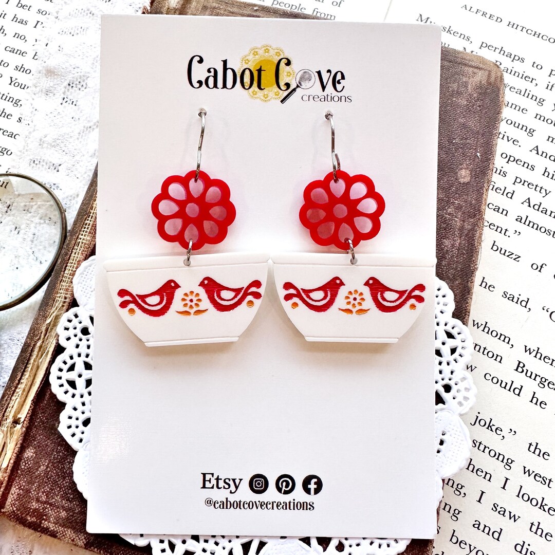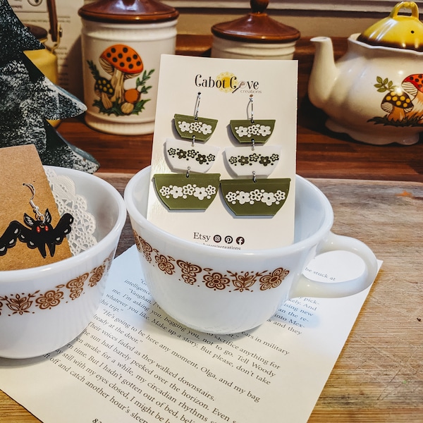 Pyrex Inspired Friendship Bowl Acrylic Earrings in White, Hand Painted ...