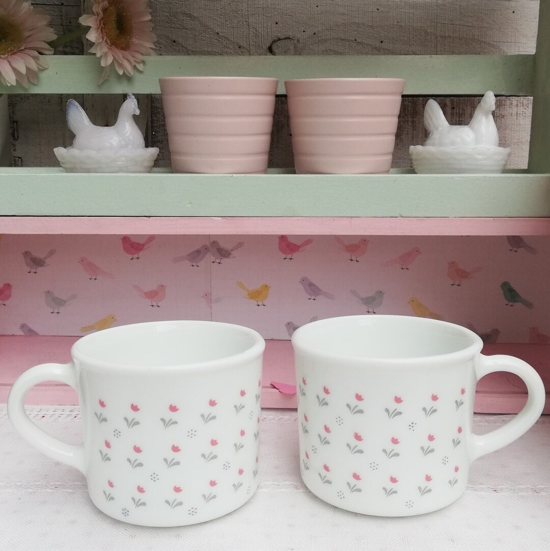 Vintage Pyrex Mugs Flowers Pink Tulip Pattern, White Thick Cups Made in ...