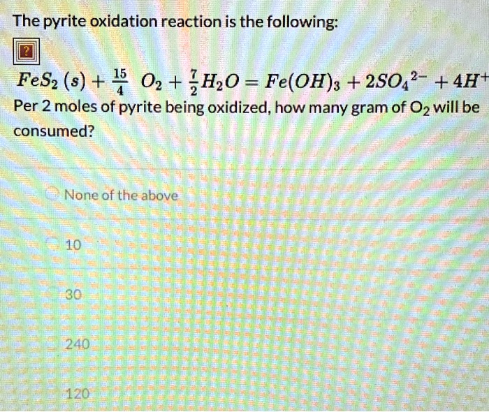 SOLVED: The pyrite oxidation reaction is the following: FeS2 (s) + 4 O2 ...