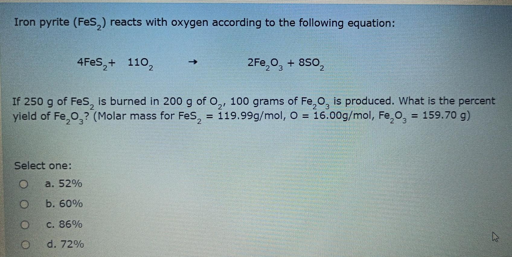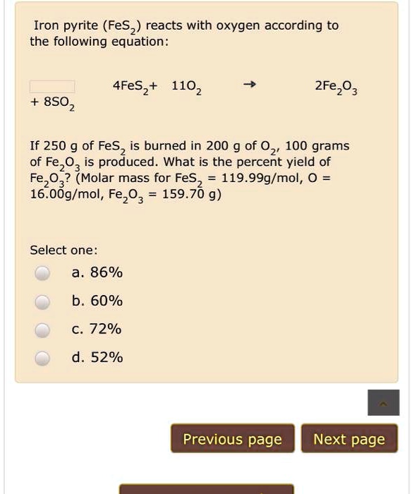 SOLVED: Iron pyrite (FeS2) reacts with oxygen according to the ...